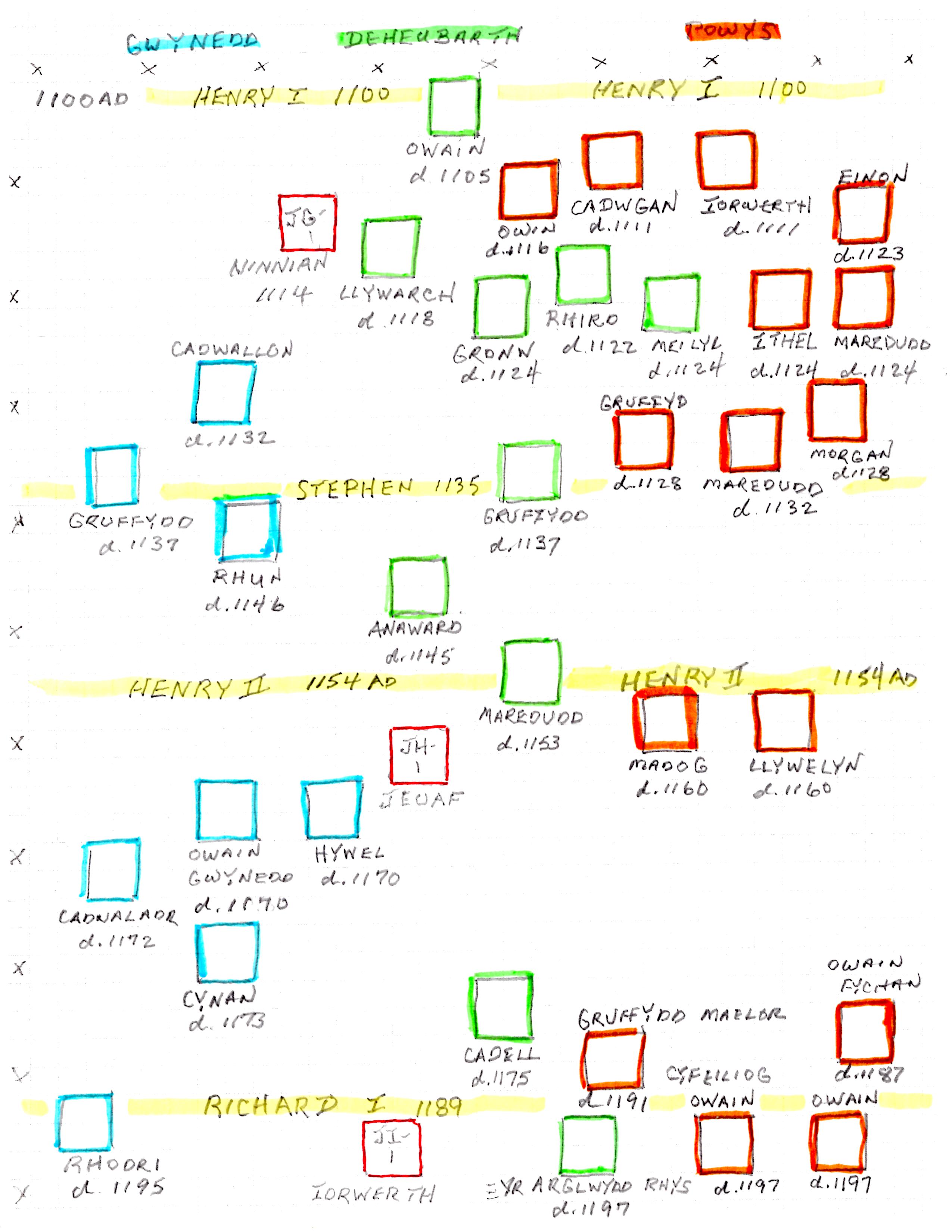 To illustrate this phenomena, the following charts are drawn to show the first 400 years of Welsh kindred leadership as translated by Lloyd (see post July 6th, 2023). The districts of Gwynedd (Royal Tribe I) colored blue, Deheubarth (Royal Tribe II) colored green and, Powys (Royal Tribe III) colored orange, are represented by the squares drawn for each individual named by Lloyd pp. 273 - 277 titled "Genealogical Tables". Each chart is drawn in chronological order for ten year periods. Significant events are listed in yellow. My family, from Tudor Trevor (JC-1) to Iorwerth (JI-1), are represented by the squares outlined in red. So, hold on to your seat belt and let's go, starting from 900 A.D.!
